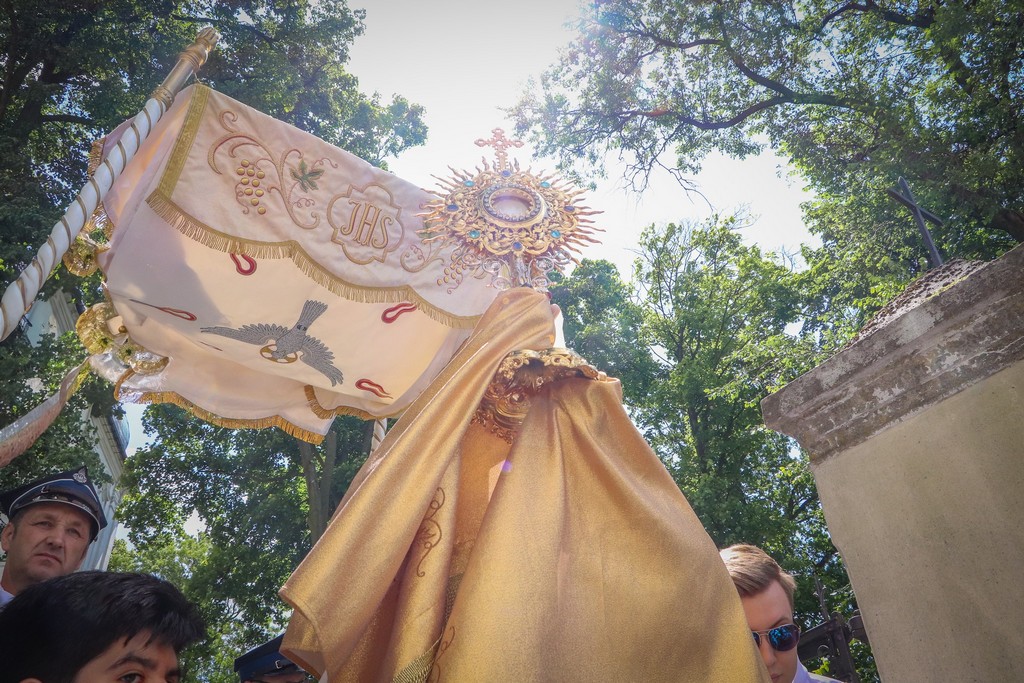 Ksiądz błogosławi wiernych Najświętszym Sakramentem